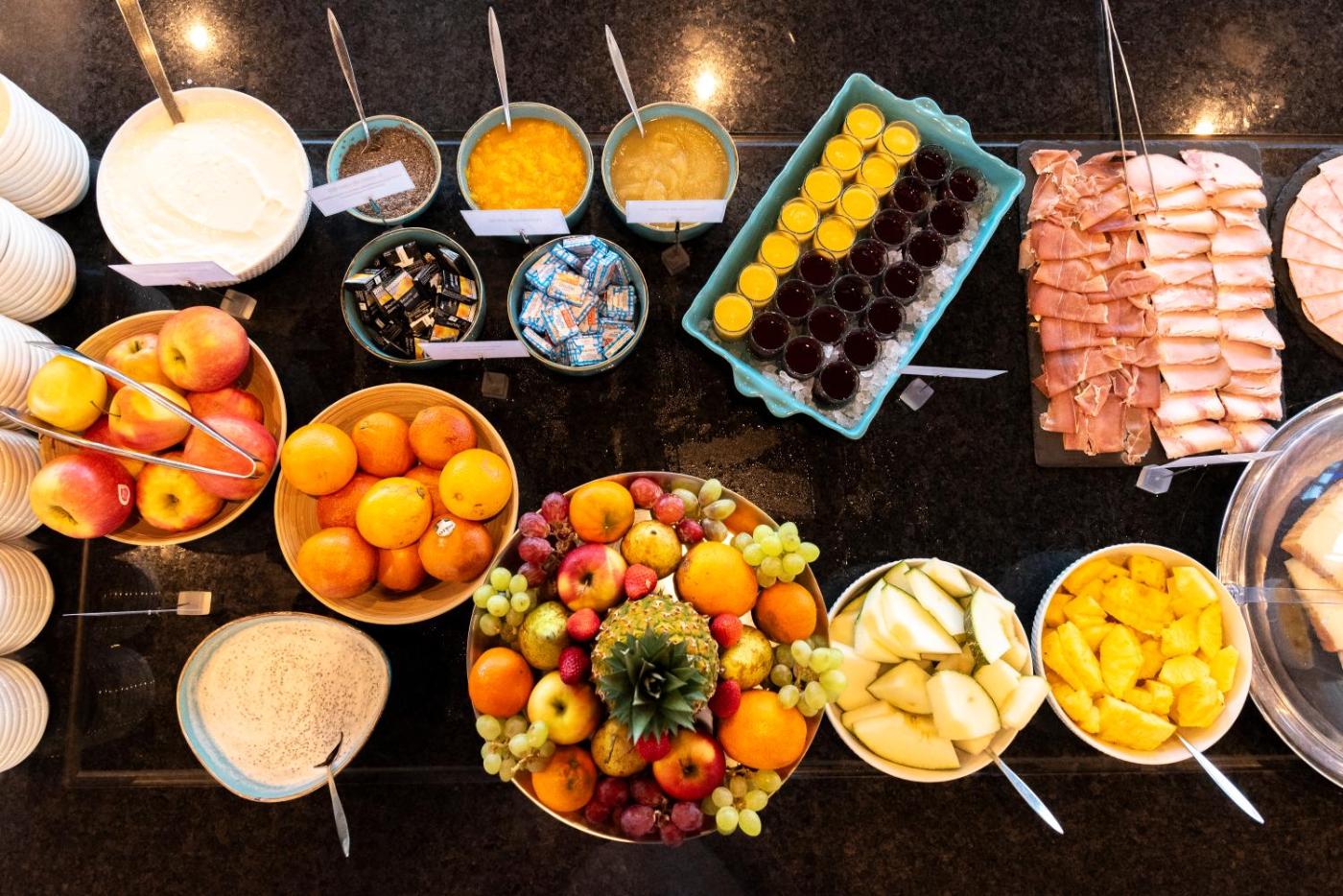 Chaque matin, l’hôtel sert un copieux petit-déjeuner buffet que vous pourrez déguster sur la terrasse en été.
