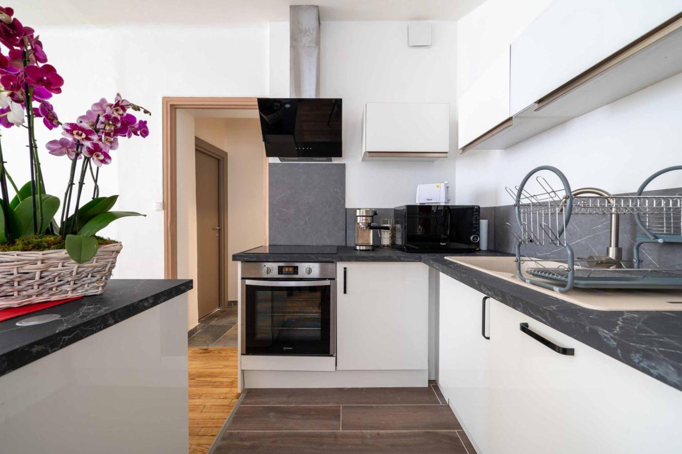 Appartement 1 Chambre. Guests can make meals in the kitchen that is equipped with a stovetop, a refrigerator, a dishwasher and kitchenware. The air-conditioned apartment provides a flat-screen TV with cable channels, a washing machine, a private entrance, a tea and coffee maker as well as city views. The unit offers 2 beds.